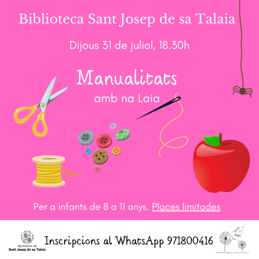 Dijous July 31, at 6:30 p.m.: Manualitats amb na Laia. For infants from 8 to 11 years old.