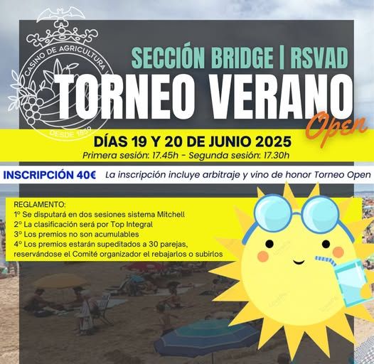 An excellent opportunity to enjoy the bridge in an enjoyable and competitive environment. We encourage you to sign up and be part of this unmissable summer date.
