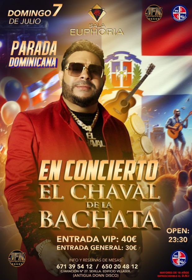 EL CHAVAL DE LA BACHATA EN CONCIERTO SALA EUPHORIA, SEVILLA El Chaval de la Bachata en Concierto Domingo 7 Julio 2024 Sala Euphoria C/ Aviación 27, Sevilla