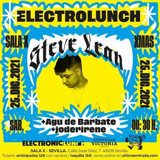 ElectroLunch es la marca más urbana de ElectronicLunch, donde los sonidos de la calle se mezclan con las últimas tendencias electrónicas en un ambiente clubbing. Para este primer evento, que tendrá lugar en la sevillana Sala X, contaremos en cabina con el capo del género, el productor STEVE LEAN, que ha trabajado con artistas de la talla de C.Tangana, J.Balvin, Mala Rodríguez o Young Beef. Le acompañan en el escenario los locales Agu de Barbate (Las Niñas) y joderirene (Pegao Club). Trap, Reggaeton y Electrónica para una noche de perreo máximo.