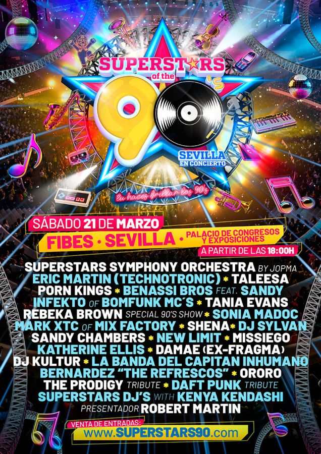 El sábado 21 de Marzo de 2026, volveremos a los 90s en Sevilla, pero a una Nueva SuperDiscoNoventera, aún más grande, el Pabellón 3 del FIBES Sevilla, Palacio de Congresos y Exposiciones. Dejamos nuestro querido Palacio de Deportes San Pablo, para mejorar en sonido, en infraestructura, y en una pista de baile mucho más grande, la mayor de Andalucía, para bailar todos juntos y así poder disfrutar al máximo de todo nuestro SuperShow, con un cartel lleno de artistas de todos los estilos, dance, latino, rock, breaks, con una decoración y espectáculo especial para la ocasión. Y con la actuación exclusiva de SuperStars Symphony Orchestra, donde volveremos a gozar los clásicos de la electrónica de los 90s con orquesta sinfónica como nunca antes habías vivido. Y es que somos de Andalucía, y sabemos lo que nos gusta.