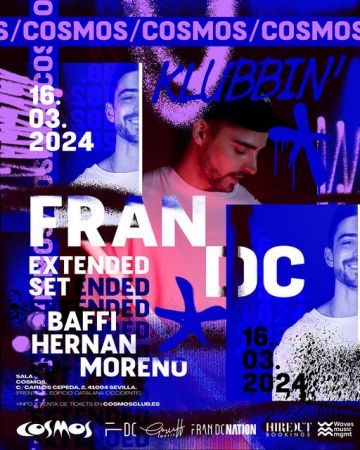 Fran es sin duda uno de los artistas con más carisma, talento y progresión de la escena electrónica nacional, con una polivalencia y técnica en cabina increíble y que ya ha demostrado en varias ocasiones en Cosmos como es capaz de ganarse al público. En esta ocasión disfrutaremos de un EXTENDED SET de 4h, donde disfrutaremos de todo su arsenal de temazos