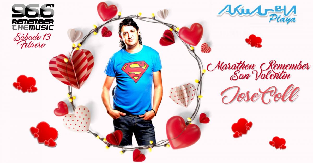Este sábado 13 de Febrero y durante todo el día no dejes de sintonizar la 96.6FM ya que celebraremos San Valentín con un gran Marathon recordando los grandes Remembers vividos en Akuarela Playa, y todo ello de la mano de Jose Coll con sesiones en directo que nos hará trasladarnos por unos momentos a la mítica sala.